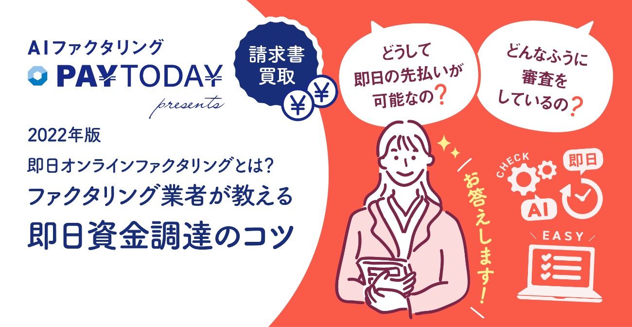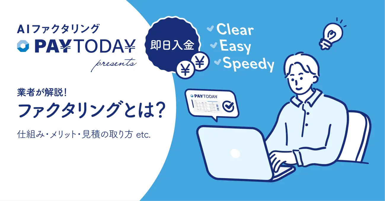お持ちの⼊⾦待ちの請求書(売掛⾦)を売却して、事業に必要な資⾦をオンラインのみで即日調達可能です。AI審査によりオンライン完結・ウェブ完結で即日審査・即日振込を実現します。法人からフリーランス/個人事業主の方まで幅広くファクタリング可能です。