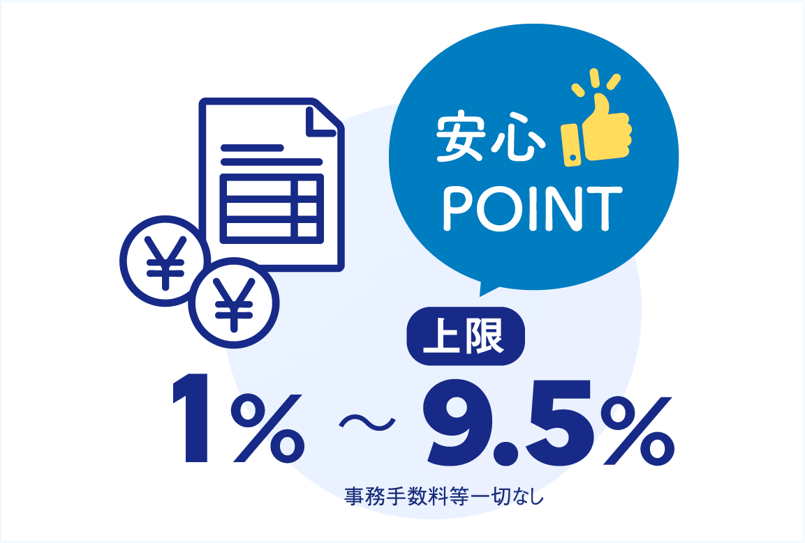 1%からで上限9.5%です。手数料は、売掛債権先の信用情報に加えて、お客様の利用状況や財務状況に基づき決定しております。