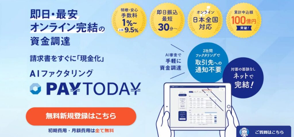 これからファクタリングをの利用したいと考えているなら、ぜひPAYTODAYをご検討ください。手数料は1~9.5%と低く抑えており、最短で即日振込も可能です。初めての方でも利用しやすいネット完結ですので、今すぐの資金調達が必要であればぜひお気軽にご利用ください。