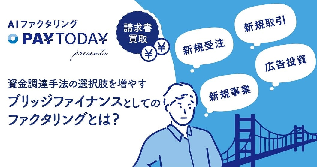 お持ちの⼊⾦待ちの請求書(売掛⾦)を売却して、事業に必要な資⾦をオンラインのみで即日調達可能です。AI審査によりオンライン完結・ウェブ完結で即日審査・即日振込を実現します。法人からフリーランス/個人事業主の方まで幅広くファクタリング可能です。